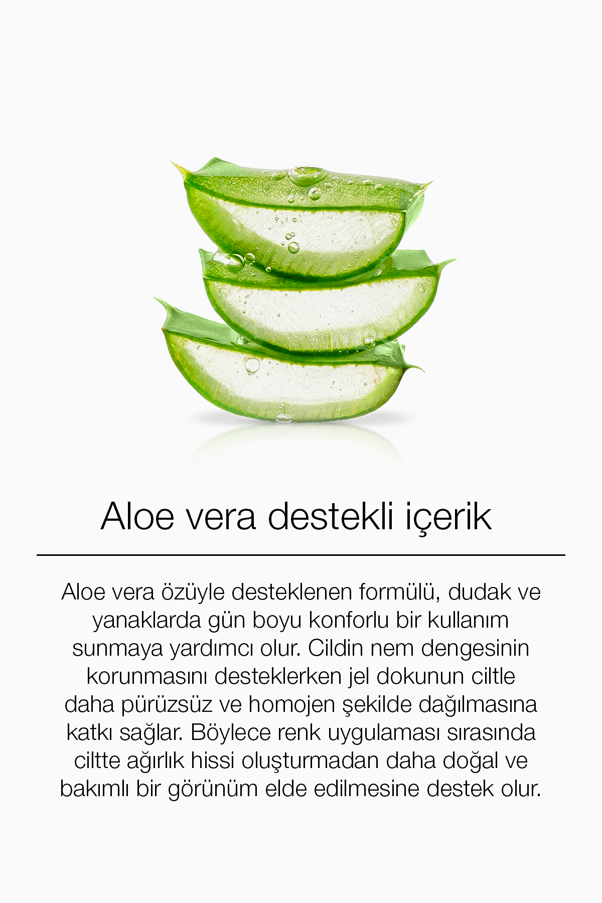 It is a make-up product that we developed to support the skin to brighten and regain moisture balance thanks to its aloe vera extract and niacinamide content, as well as to color your lips and cheeks with its gel texture and homogeneous distribution. It aims to provide long-term coloring of the skin surface without weighing down the skin with its easy use. Thanks to its rich color options and structure that appeals to all skin tones, it aims to help your face and lip area look smoother, livelier, natural and well-groomed.