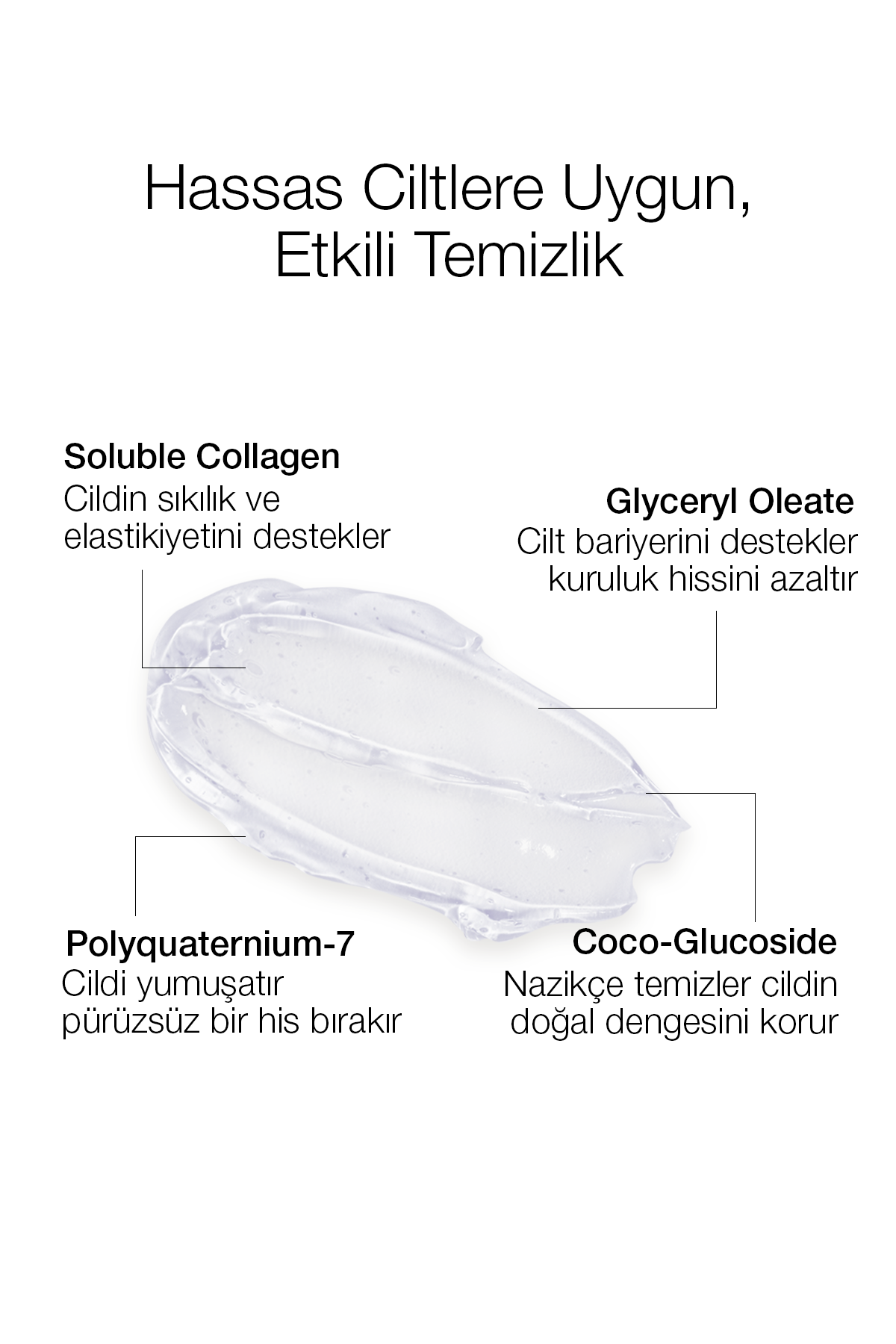 Kolajen içeriğiyle yaşlanma belirtilerine yönelik bakıma yardımcı olmayı amaçlamaktadır. Kuruluk hissi bırakmayan yapısıyla cildinizi temizlerken doğal nem dengesini korumaya destek vermeyi hedeflemektedir. İçerik özelliği sayesinde, cilt temizliği sırasında verdiği destekle cildin elastikiyetinin artmasına ve çevresel koşullara karşı korunmasına yardımcı olur. Düzenli kullanımla, daha temiz ve pürüzsüz bir cilt görünümü için katkı sağlar.