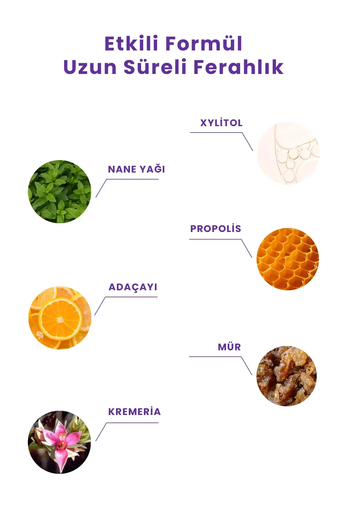 İçeriğindeki Xylitol ve Nane Yağının desteği ile ağız içi bakıma yardımcı olmasının yanı sıra ağız kokusunun önlenmesine katkı sağlayarak, nefesinizin tazelenmesini ve uzun süreli ferah kalmasına destek vermek için geliştirdiğimiz bir kişisel bakım ürünüdür. İçeriğindeki Adaçayı, Propolis, Mür ve Kremeria Ekstraktlarının sayesinde diş etlerinin güçlenmesini desteklerken, diş ve diş eti bakımına yardımcı olmayı amaçlamaktadır.